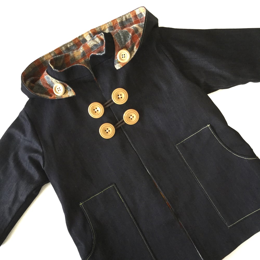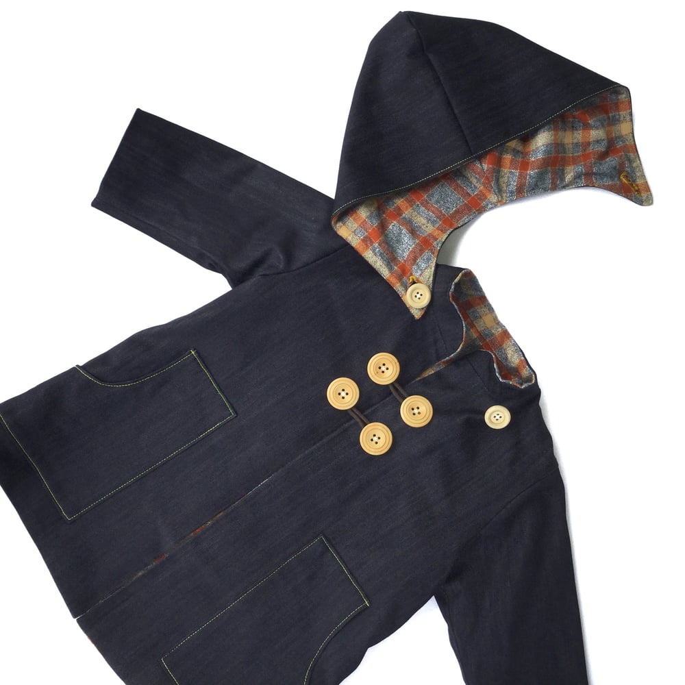 ◆ R O G E R S ◆ 100% cotton reversible winter coat. dark denim, flannelette, wood.